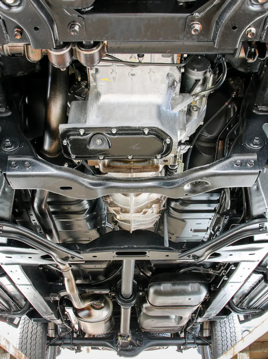Évaluation des lignes de frein, hoses, échappement, boots d’arbre de transmission, joints et état général du châssis.